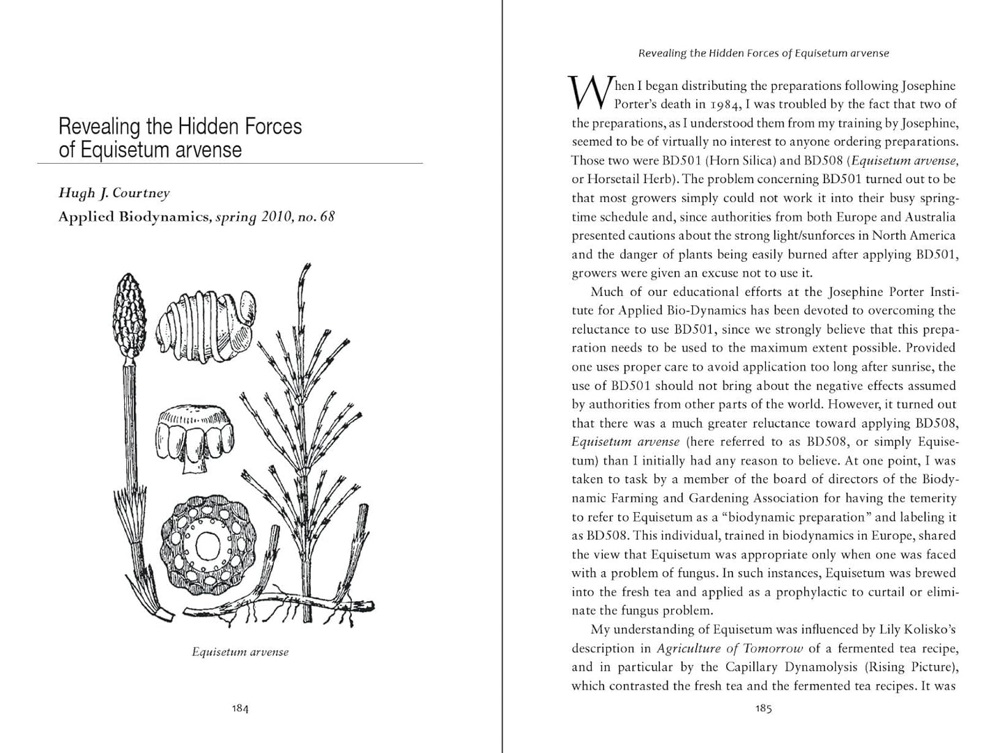 Hugh J. Courtney (1932-2020), a veteran and librarian, discovered Steiner's agriculture course in 1975 at a health food store in College Park, Maryland. This led him to Josephine Porter, who was making biodynamic preparations according to Steiner's indications. He apprenticed under Josephine and, when she died in 1984, took up her work. He created the Josephine Porter Institute in Woolwine, VA, where he has been making and selling preparations (six compost preparations and 3 others), editing the newsletter Applied Biodynamics, and consulting on all aspects of the biodynamic approach. Hugh Jordan Courtney passed the threshold quietly in his sleep on June 15, 2020, at the age of 87 in Woolwine, Virginia.