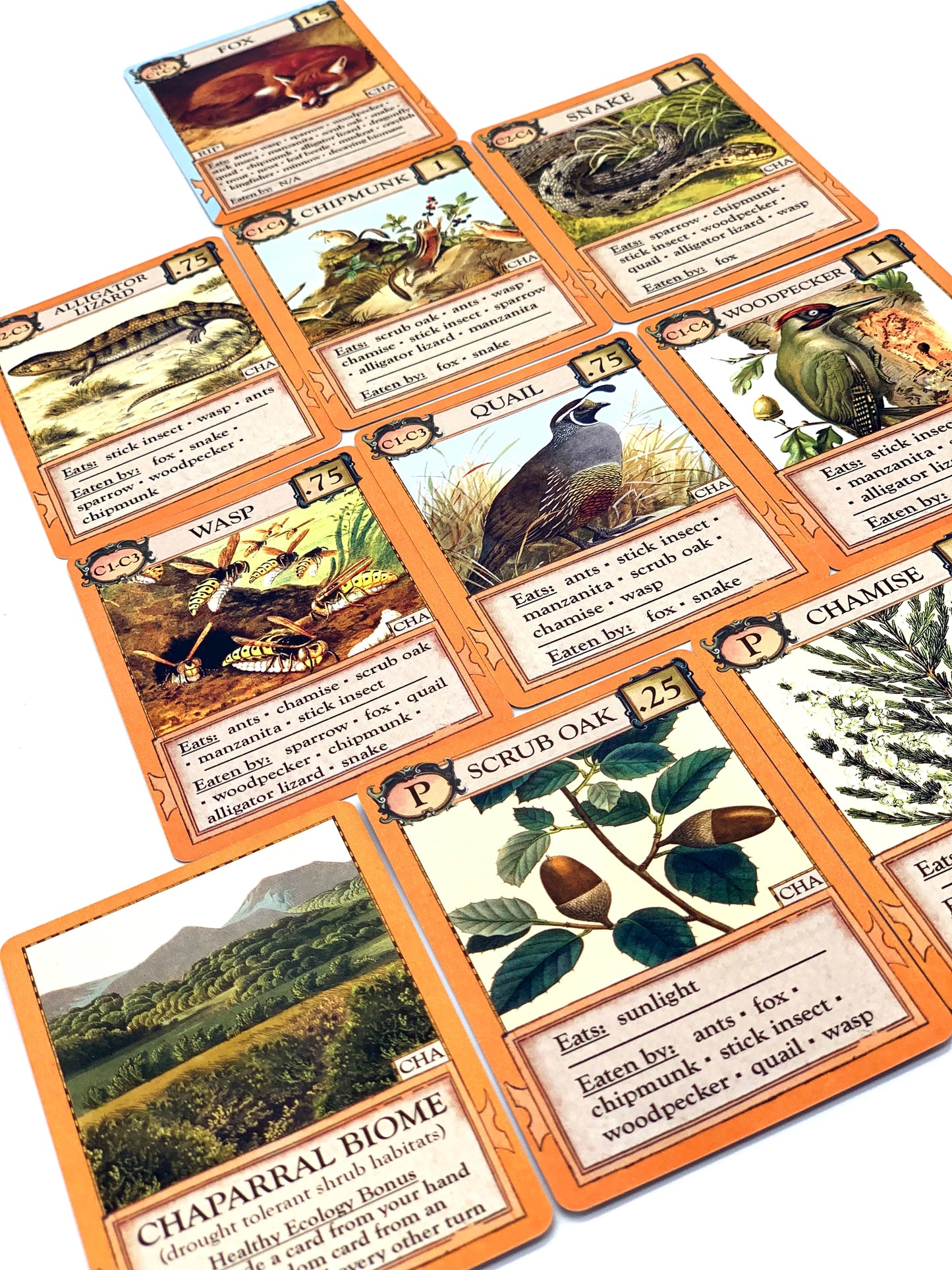 Cards are arranged with plants on the bottom and predators on top. Players negotiate trades and use biotic and abiotic factor cards to affect their webs and the webs of players around them. It is a race to get to 12 victory points, with players using different strategies such as focusing on one biome, going for perks and bonuses, or disrupting other ecologies.