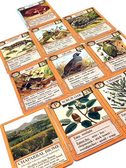 Designed by a biology teacher, the game includes 77 unique organisms, 7 biomes, and beautiful vintage Victorian art. (108 cards total)
