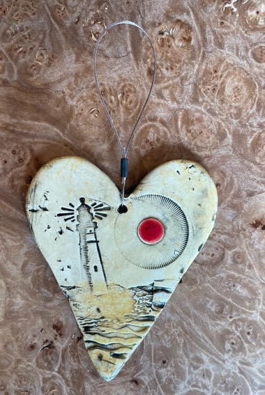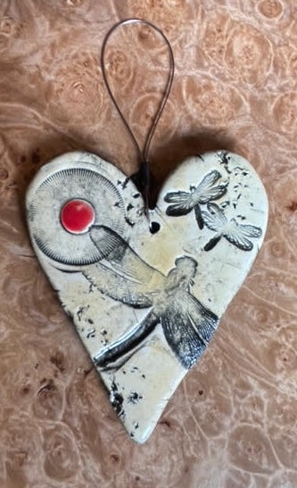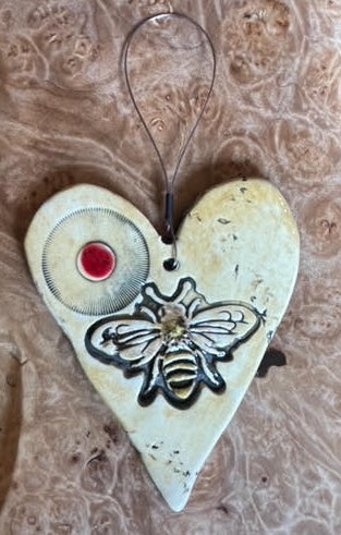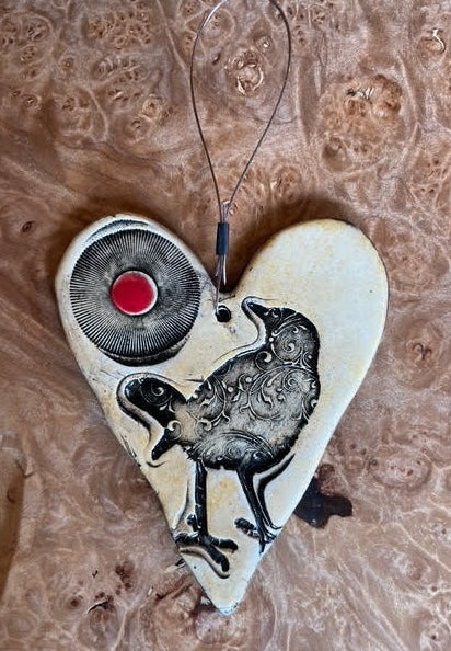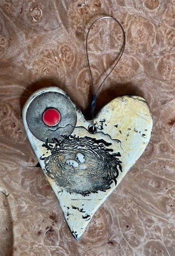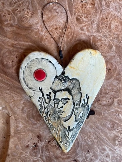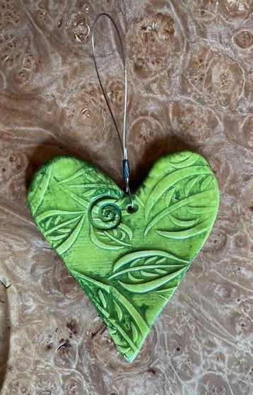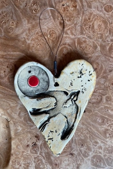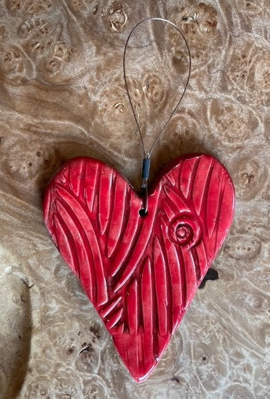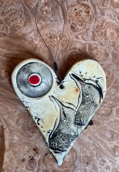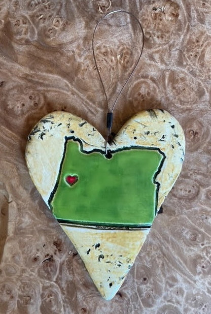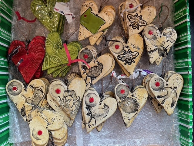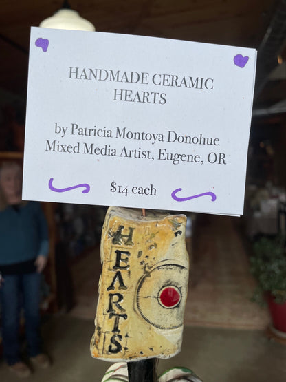 Beautiful handmade, colorful, glazed ceramic heart ornaments by Mixed Media Artist, Patricia Montoya Donohue from Eugene, Oregon