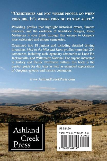 Author Johan Mathiesen has traveled to each and every one of these cemeteries and provides detailed profiles that highlight unique historical events, famous residents, and the evolution of headstone designs. Mathiesen also highlights which cemeteries around the state should be on every traveler's and historian's "must visit" list -- and why. Mad as the Mist and Snow, written for anyone interested in history, cemeteries, and Pacific Northwest culture, is the perfect guide for both day trips as well as extended explorations of Oregon's eclectic and historic cemeteries.