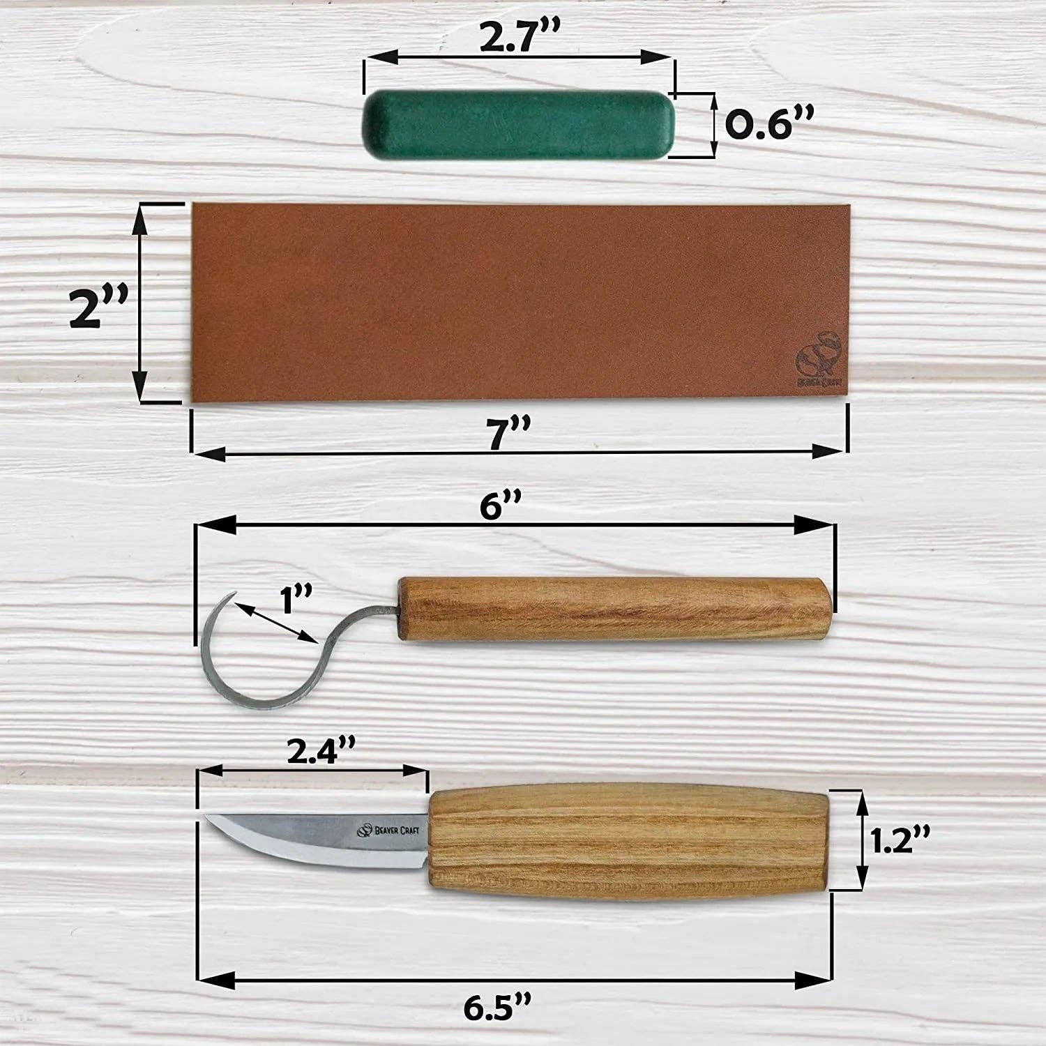 - Basic spoon carving set * The blades are made of high-quality carbon steel * Ready to use right out of the box * Comes with a leather strop and green-grey polishing compound Spoon carving tools set is ideal for cutting spoons from a wood. This set includes a whittling knife and wood carving spoon hook knife. With the whittling knife, you give shape to the spoon, then with the hook knife, you cut out the spoon and smooth wood out and that's all, your spoon is ready. The wood carving tools for cutting wooden spoons are made from durable high carbon steel and well sharpened, which allows you to cut soft and hardwood. Handles are made from Ashwood and covered with linseed oil.