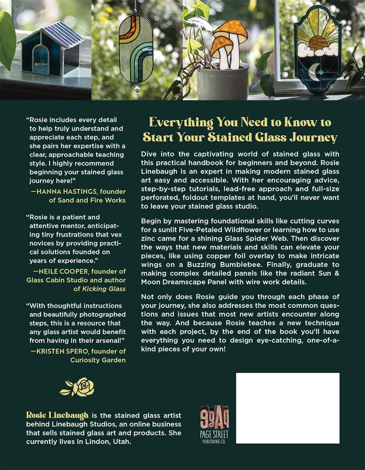 Dive into the captivating world of stained glass with this practical handbook for beginners and beyond. Rosie Linebaugh is an expert in making modern stained glass art easy and accessible. With her encouraging advice, step-by-step tutorials, lead-free approach and full-size perforated, fold-out templates at hand, you'll never want to leave your stained-glass studio. Begin by mastering foundational skills like cutting curves for a sunlit Five-Petaled Wildflower or learning how to use zinc came for a shining Glass Spider Web. Then, discover the ways that new materials and skills can elevate your pieces, like using copper foil overlay to make intricate wings on a Buzzing Bumblebee. Finally, graduate to making complex detailed panels like the radiant Sun & Moon Dreamscape with wire work details.