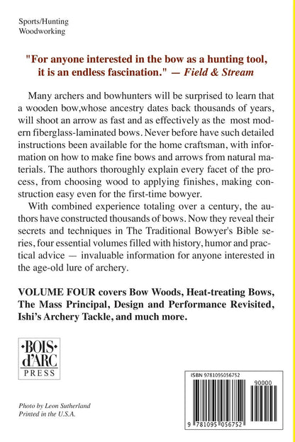 With combined experience totally over a century, the authors have constructed thousands of wooden bows. Every facet of the process is thoroughly explained, making construction easy even for the first-time bowyer. Volume four covers Bow Woods, Heat-treating Bows, The Mass Principal, Design and Performance Revisited, Ishi's Archery Tackle, and much more.