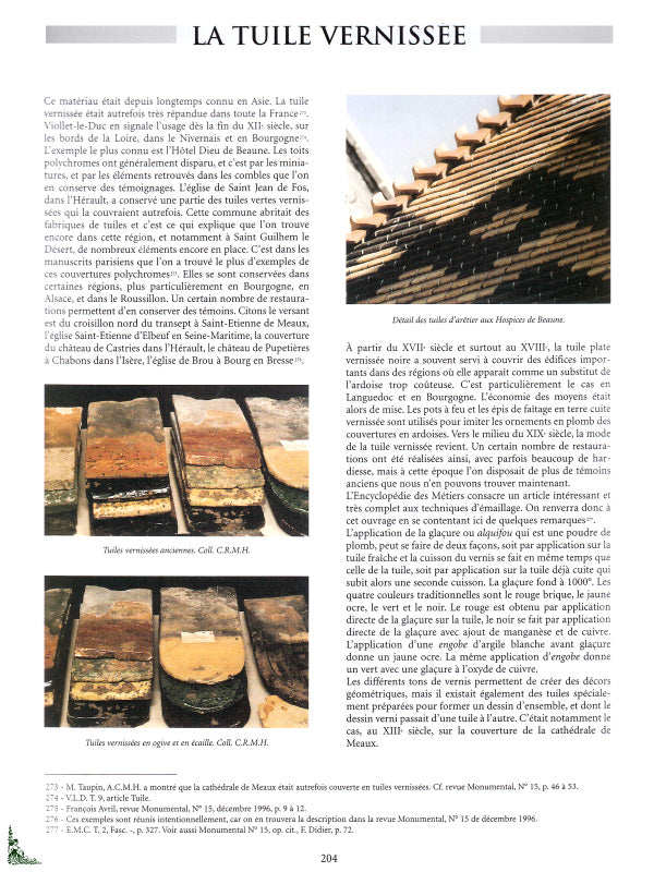 For each material discussed, it specifies its history and its evolution, recalls the architectural context and the forms of roofs associated with it, explains the specific laying techniques and describes the maintenance. He particularly insists on the characteristics of each region of France, whether it is royal roofs or a humble mound of thatch.