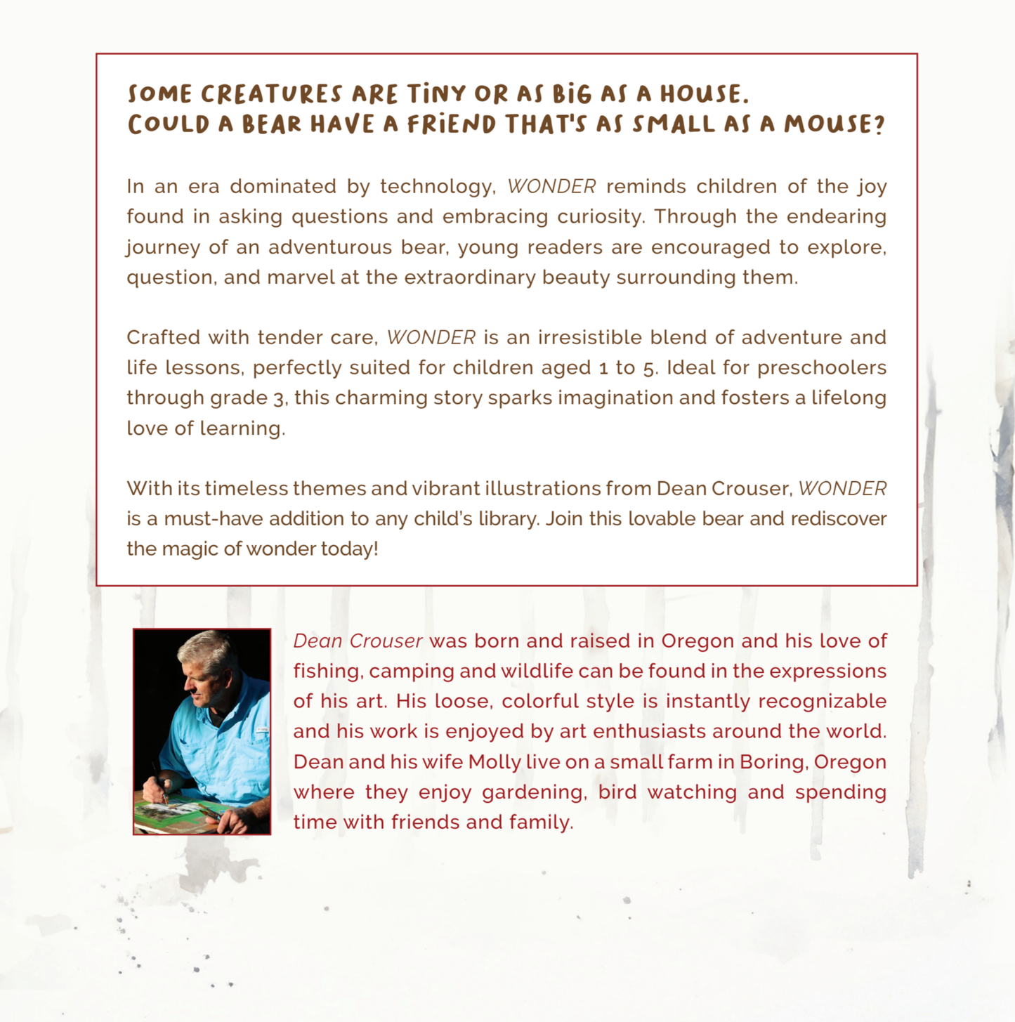 WONDER: A Bear's Journey' is a children's book written and illustrated by Dean Crouser. In an era dominated by technology, WONDER reminds children of the joy of asking questions and embracing curiosity. Through the endearing journey of an adventurous bear, young readers are encouraged to explore, question, and marvel at the extraordinary beauty surrounding them. With its timeless themes and vibrant illustrations from Dean Crouser, WONDER is a must-have addition to any child's library. Join this lovable bear and discover the magic of wonder today!